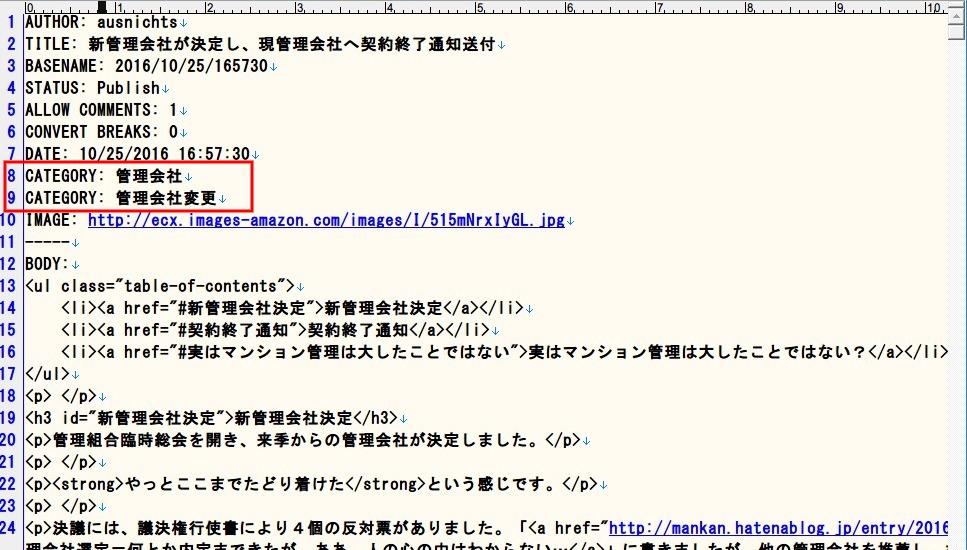 - ファイルをエディタで開き、カテゴリーを削除、修正など、ひとつのカテゴリーに変更します。