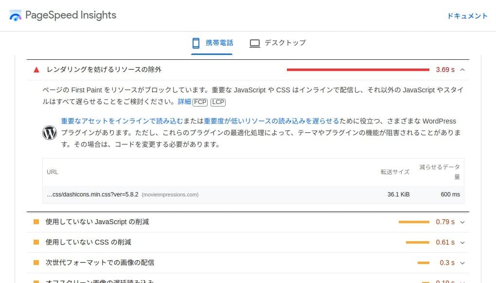 なぜこの件を思い立ったかは、Google の PageSpeed Insights で「そんなには褒めないよ。映画評」のページパフォーマンスを見てみましたら、dashicons.min.css が「レンダリングを妨げるリソース」と表示されたからです。